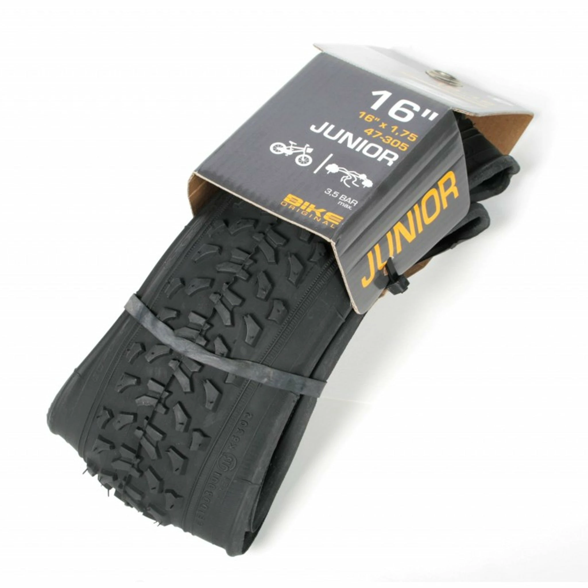 Le pneu junior équipe les vélos enfants ou pliants de 16 pouces. Robuste avec ses crampons hauts, il apporte un bon confort et une bonne tenue de route en chemin. La pression de gonflage maximale est de 3.5 Bar.